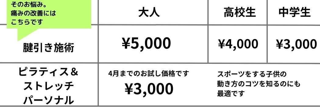 営業日のお知らせ 12月の21日は勉強会のためお休みとなります。お正月は31日より1月3日までお休みです。ぎっくり腰等、急な痛みはご連絡ください。元旦以外、可能な場合は対応したします。毎週木曜日は杵築市山香町での出張施術のため大分店舗はお休みとなります。。 こんなお悩みはありませんか? 《 新着 腱引きブログ 》 お知らせ ココロとカラダ 大分市整体 姿勢、体の使い方 ピラティス&ストレッチを始めました By isayama / 2025年12月15日 ピラティス&ストレッチを始めました こん... Read More 大分市整体 姿勢、体の使い方 腰の痛み、腰痛緩和 膝痛、膝の痛み、可動不全 足首の硬さが、膝や腰の痛みの原因に? 〜足首から始める整体のススメ〜 By isayama / 2025年7月6日 足首の硬さが、膝や腰の痛みの原因に? こ... Read More ココロとカラダ 大分市整体 姿勢、体の使い方 未分類 痛みを改善するには運動もとっても大切という話 By isayama / 2024年7月23日 体の痛みには運動がとっても大事! 体の痛... Read More 大分市整体 腱引きとは 痛いところが本当に原因なの? By isayama / 2024年4月19日 痛むところが動いていく? 腱引きで痛みを... Read More 腰の痛み、腰痛緩和 背中痛、臀部痛のお客様改善のお話 By isayama / 2023年12月26日 背中とお尻が痛い……そんなお客様改善のお... Read More ココロとカラダ 大分市整体 心の声を聞きすぎず、体の声を聞く By isayama / 2023年12月25日 ぐるぐる思考に悩んでいませんか? 自分も... Read More スポーツの痛み、体の使い方 大分市整体 野球肘、野球肩にも腱引きを By isayama / 2023年7月10日 野球で起こる肘や肩の痛みには 野球という... Read More ココロとカラダ 大分市整体 本来の自分になるための腱引き整体 By isayama / 2023年6月14日 痛みが自分を欠けさせる いつまでも続く身... Read More ココロとカラダ 大分市整体 不機嫌な体をご機嫌にする腱引き療法 By isayama / 2023年2月20日 痛みは体を不機嫌にする こんにちは。腱引... Read More 大分市整体 肩首の凝り、痛み、緩和 【腱引き】肩が後ろに回せなくてエプロンも付けられない【改善】 By isayama / 2022年6月27日 肩を後ろに回すと痛い……腱引きで解決! ... Read More ブログ一覧はこちら 》 ホーム 予約&アクセス 施術料金 腱引きってなあに? ピラティス&ストレッチ ブログ お悩み別メニュー 腰痛、ぎっくり腰 頭痛、片頭痛 座骨神経痛 四十肩、肩の痛みこり 捻挫、スポーツ障害、成長痛、野球肘肩 腱引きは、こころとからだのカンフル剤 痛みを改善したい。腱引き整体は、そんな思いに本気で応えていきます。 痛みで身体が弱ってしまえば、心も弱ってしまう。ストレスや悩みで心が疲れれば、身体も疲れてしまいます。 毎日がなんだかつらい。そんなとき。いつもの整体やカイロ、マッサージとはちょっと違う。 腱引きという日本古来の整体、「腱引き整体」でお身体を調整し、健やかな心を取り戻しませんか。 私にそのお手伝いをさせてください。 大分市明野、猪野地区整体所腱引き整体大分からだ改善庵腱引き師 諫山寿樹 腱引きの改善事例 腱引き整体は、直接、筋肉や腱を引くことで誤った神経への刺激や血行不良などを改善させ、お体の「自分で治そうとするちから」を高める事により、体の不調を改善しようとする施術です。筋整流法で改善した事例には、 ★腰痛、肩こり・ひじ・ひざの屈伸不全★スポーツの痛み、パフォーマンスアップ★四十肩・五十肩、股関節の痛み・坐骨やお尻のまわりのしびれ、痛みなどのお悩み★偏頭痛・全身疲労・いつまでも続く重い疲れに★寝違え・むちうち症・自律神経失調症・便秘 などなどになります。 私はこの「腱引き整体」の技を使い、お身体に悩むあなたのお力になりたいと願っています。 大分市は猪野にある民家の一室が施術所となります。目の前が保育園で、子供の笑い声がBGMなことも。 腱引きはベッドではなく床での施術になります 施術の流れ ① カウンセリング まずはお体の不調をお聞きします。不調の期間、原因と思われる事柄、また生活習慣などからどこに根本的な原因があるかの見当をつけていきます。 ※当道場へ訪れる際は、ジャージなど、動きやすい服装でお越しください。ジーンズのような固い生地、またウィンドブレイカー等の滑りやすいナイロン地では施術の効果が薄れる場合があります。 ② 腱引き施術 問診後、施術に入ります。 最初から不調の出ている箇所に触れるのではなく、 主には腰、背中から始め、全身を通して不調の出ている箇所を改善させていく施術となります。これは、身体はすべて繋がっているという考えのもと、痛みにより崩れた繋がりのバランスを取り戻すことも大事だと考えるからです。 ③ 運動指導 施術後は適切な運動指導も行わせて頂きます。 ス腱引きの効能を長く保つのは日常生活での姿勢、運動等が鍵となります。そのうえで定期的な腱引きとの二人三脚により、痛みの戻りにくい身体へと改善されていきます。 Q. 予約が必要ですか? A. 当店は完全予約制となっており